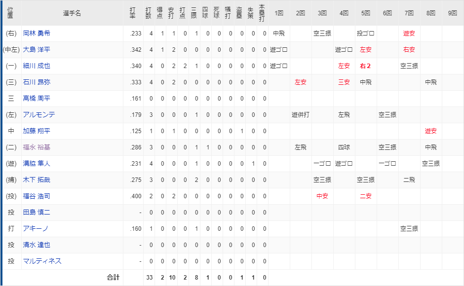 ヒットは10本出てますがやはり得点圏で打てる選手がいると違いますね。