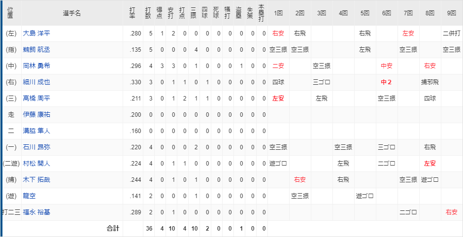 【試合結果】6/9(金)vs 楽天 楽天モバイル by しみたー · 公開済み 2023年6月9日 · 更新済み 2023年6月14日 まけほー。 10安打出て4点は入ったんですが残念ながら追いつけず。 なんだかもったいない試合でした。 小笠原もかなりの球数投げましたがあまりに引っ張りすぎるのも問題ですね。 中継ぎが疲弊しているのはわかりますが・・・。 共有: Facebook で共有するにはクリックしてください (新しいウィンドウで開きます) Facebook クリックして X で共有 (新しいウィンドウで開きます) X いいね:いいね 読み込み中…