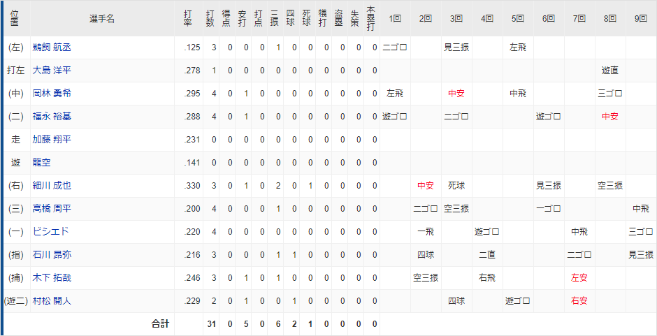 【試合結果】6/10(土)vs 楽天 楽天モバイル by しみたー · 公開済み 2023年6月10日 · 更新済み 2023年6月11日 見事な完封負け。 今日は全く打てませんでした。 松葉も5.1回を1失点と試合は作っています。 もっと投げれるかな?と思ったんですが。 中継ぎも少し休めたので祖父江・福・勝野も0点に抑えることが出来ています。 明日は勝てるといいな。 共有: Facebook で共有するにはクリックしてください (新しいウィンドウで開きます) Facebook クリックして X で共有 (新しいウィンドウで開きます) X いいね:いいね 読み込み中…